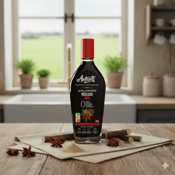 - Composition : eau, arôme réglisse, arôme naturel d’anis étoilé, arômes naturels, extrait de gentiane