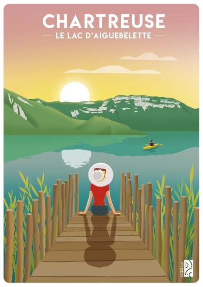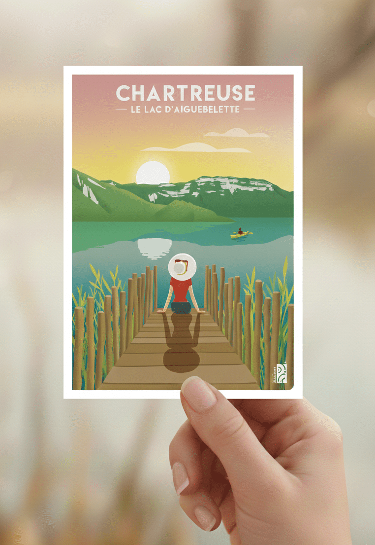 Plongez dans la sérénité du lac d’Aiguebelette avec cette carte décorative illustrée par Audrey, artiste de Voiron.