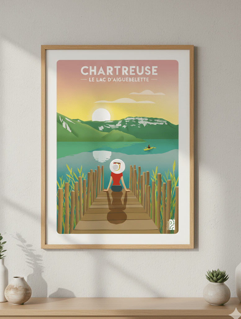 Plongez dans la sérénité du lac d’Aiguebelette avec cette carte décorative illustrée par Audrey, artiste de Voiron.